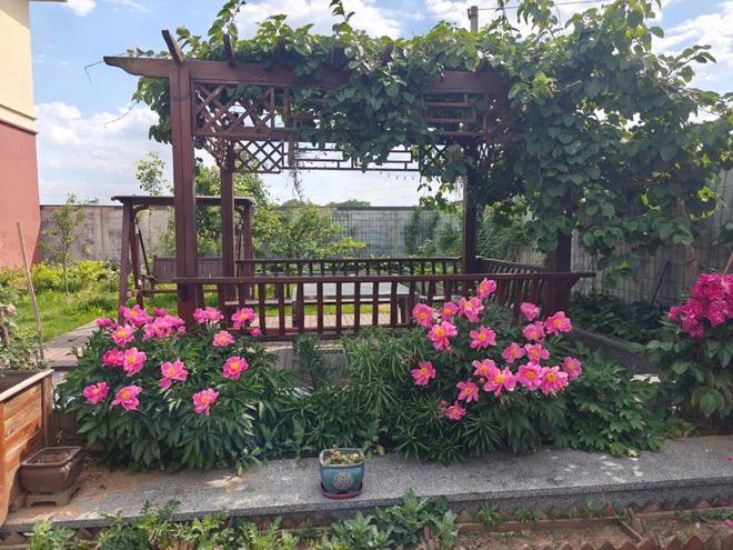 走近张丽的家,首先映入眼帘的是一栋现代建筑风格的二层小楼。她家的庭院内部布局精巧,划分出休闲赏景、果蔬种植、花卉培育等多个功能区域。步入其中,石板小径蜿蜒向前,两侧绿植高低错落,春赏樱花烂漫,夏观荷花亭亭,秋品金桂飘香,冬览腊梅傲骨,四季景致更迭,美不胜收。初夏时节庭院内凉亭架上爬满了葡萄藤和软枣藤,一簇簇粉色芍药花争相怒放,一家人坐在木椅上欣赏院内美景和休闲纳凉。