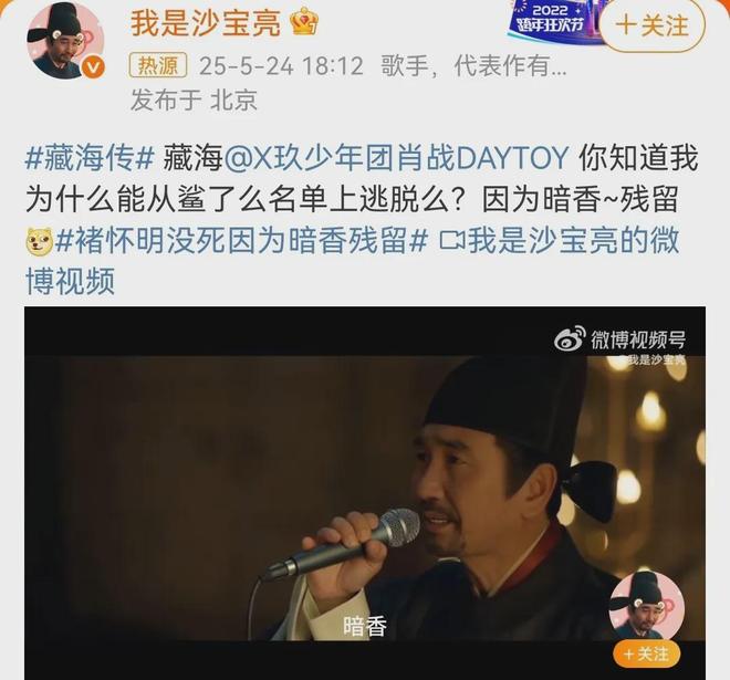 褚怀明被发配时,沙宝亮还发文说:“你知道我为什么能从鲨了么名单上逃脱吗?因为暗香~残留。”